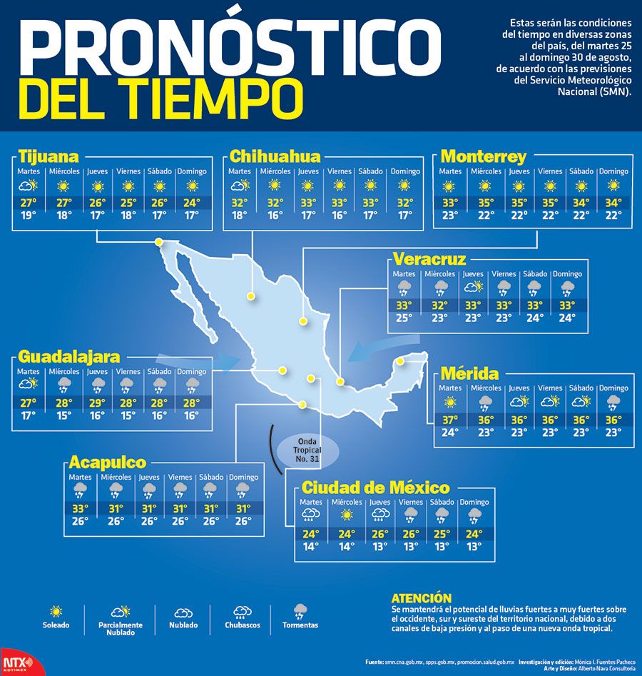 El Servicio Meteorológico Nacional (SMN) pronosticó potencial de precipitaciones muy fuertes en Veracruz, Oaxaca y Chiapas; fuertes en Baja California Sur, Sinaloa, Durango, Hidalgo, Puebla, Tabasco, Campeche, Yucatán y Quintana Roo.