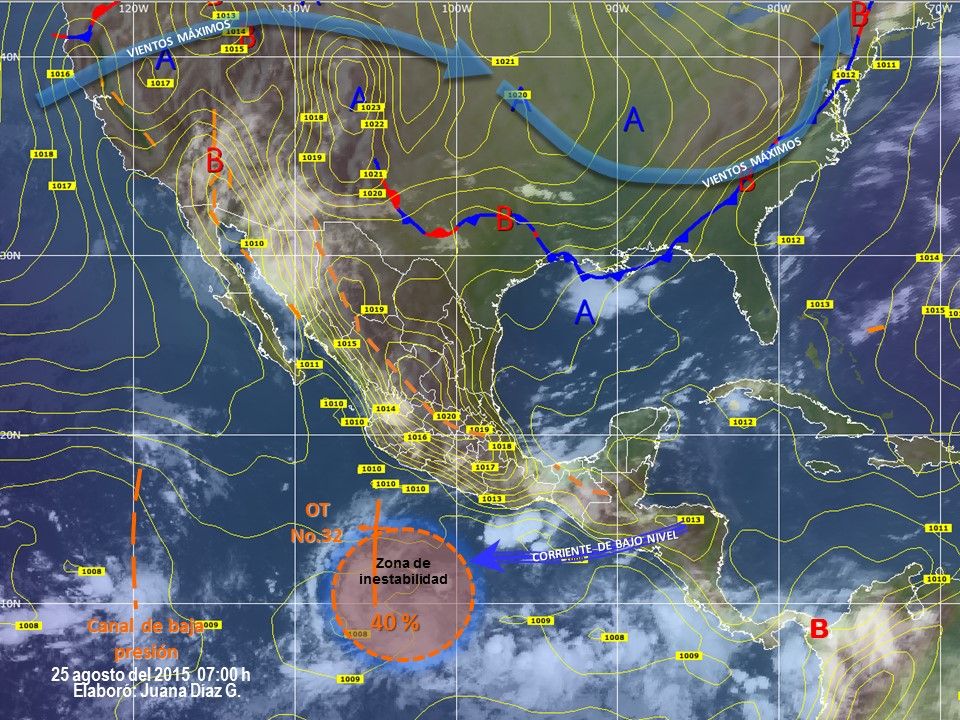 Al sur de las costas de Colima la onda tropical número 32 se asociará con una zona de inestabilidad con potencial ciclónico, viéndose reforzado el potencial del lluvias en el occidente de la nación.