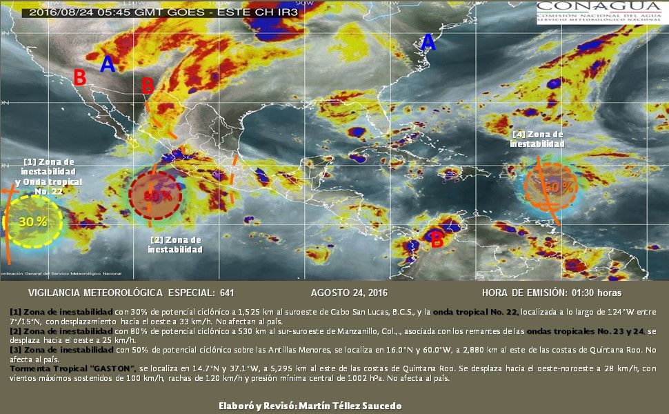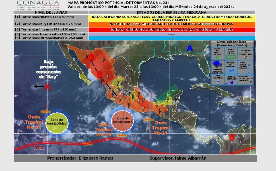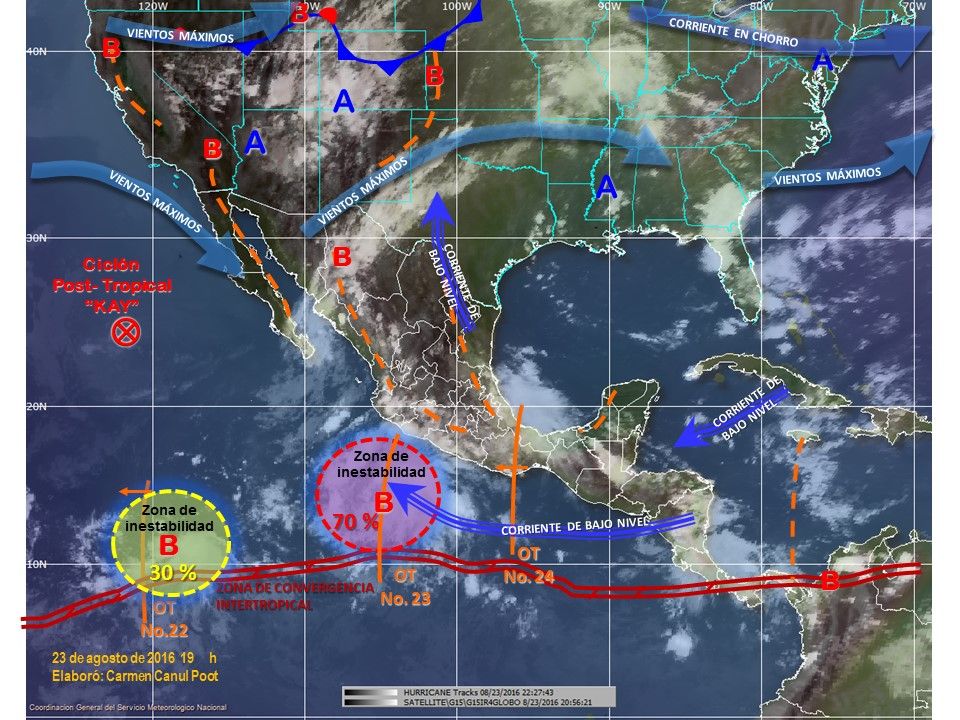 La onda tropical número 23, misma que se mantendrá en estrecha vigilancia, continuará asociada con la zona de baja presión con potencial de desarrollo ciclónico al sur de su eje, localizándose al suroeste de las costas de Colima y Jalisco.