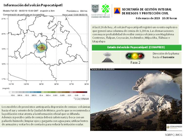 La Secretaría de Gestión Integral de Riesgos y Protección Civil informó que tras la explosión en el volcán Popocatépetl ocurrida este miércoles, la ceniza podría alcanzar la zona sur-sureste de la Ciudad de México.