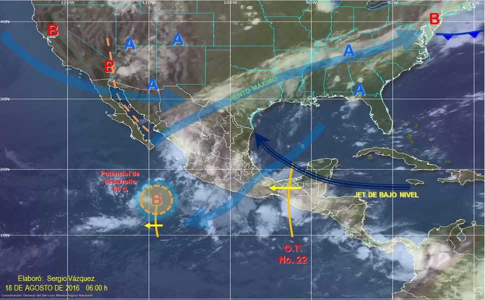 El noroeste y occidente de México se extiende un canal de baja presión; y al sur de las costas de Jalisco se presenta la onda tropical número 21; ambos sistemas generarán potencial de tormentas puntuales intensas en Chihuahua, Durango, Sinaloa, Nayarit y Jalisco.