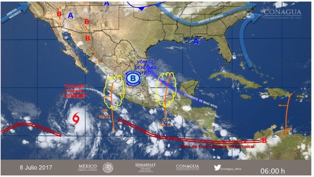 Este sábado se prevén lluvias de diferente intensidad en el país, las cuales serán ocasionadas por una amplia zona de nublados generada por la onda tropical número 11 que se localiza en el occidente del país, una zona de inestabilidad en el oriente de la Mesa del Norte y la onda tropical 12 en el sureste del país.