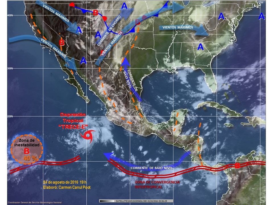 Se prevé que la Depresión Tropical 13-E incrementará la intensidad de sus vientos en las próximas horas y posiblemente alcanzará la categoría de tormenta tropical, localizándose aproximadamente a 780 kilómetros al sur-suroeste de Cabo San Lucas, Baja California Sur, generando tormentas fuertes (de 25 a 50 mm) en Baja California Sur.