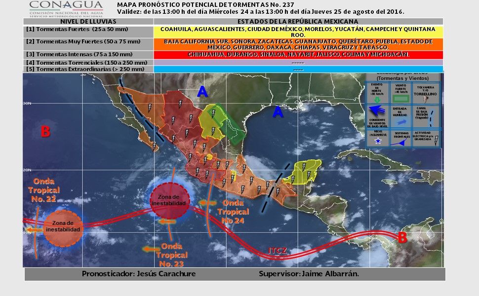 La Onda Tropical Número 24 se localizará al suroeste de Colima y Jalisco, lo que provocará tormentas muy fuertes (de 50 a 75 mm) en sitios de Jalisco y tormentas fuertes en zonas de Colima, Michoacán y Guerrero.