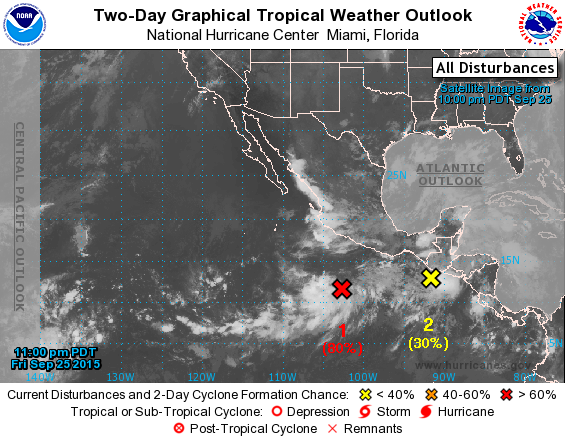 El Servicio Meteorológico Nacional informó que en la noche del viernes, la zona de inestabilidad se encuentra a 640 kilómetros al sur de Acapulco y se desplaza al norte con rachas de vientos de 30 kilómetros por hora que alcanza un máximo 40 kilómetros por hora.