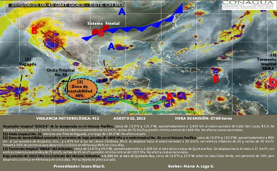 A las 19:00 h del tiempo del centro de México, la tormenta tropical Erika, ubicada en el Atlántico, se localizó a tres mil 640 km al este de las costas de Quintana Roo, con movimiento al oeste de 31 km/h, vientos máximos sostenidos de 65 km/h y rachas de hasta 85 km/h.