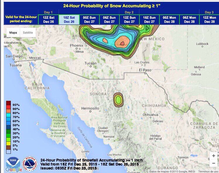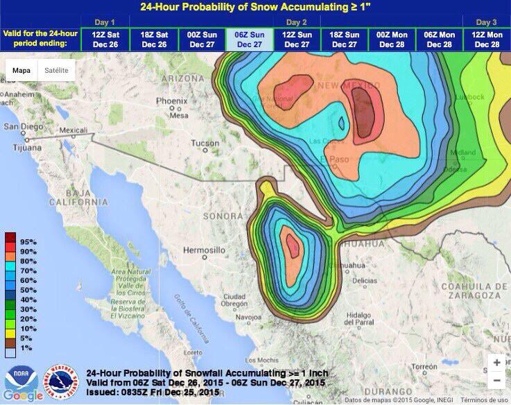 La Comisión Nacional del Agua a través del Servicio Meteorológico Nacional informó del inicio de una posible nevada en los estados de Sonora y Chihuahua, a las 12 h del viernes 25 de diciembre al sábado 26 de diciembre, esto como resultado del frente frío número 23 y 24.