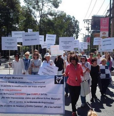 Paralelo a los eventos culturales, gastronómicos y performance de la Caminata Masaryk, vecinos de la colonia Polanco protestaron en contra de la inauguración de esta obra que ahora contempla dos nuevas licitaciones para colocar placas metálicas sobre los camellones de la avenida.