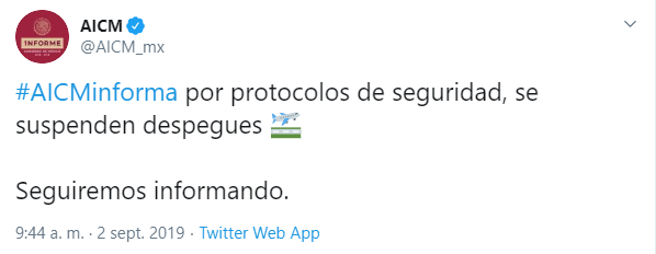 “#AICMinforma por protocolos de seguridad, se suspenden despegues ?Seguiremos informando”, señaló la autoridad a través de redes sociales.