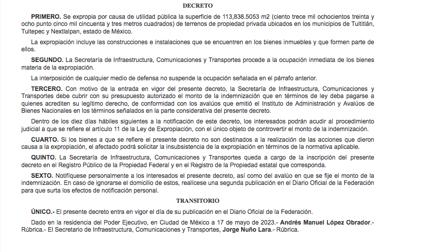 Un nuevo decreto apareció publicado en el Diario Oficial de la Federación (DOF) ordena la expropiación de terrenos de propiedad privada que se localizan en los municipios de Tultitlán, Tultepec y Nextlalpan, en el Estado de México para la construcción de los Centros de Transferencia Modal del Tren Suburbano al Aeropuerto Internacional Felipe Ángeles (AIFA).