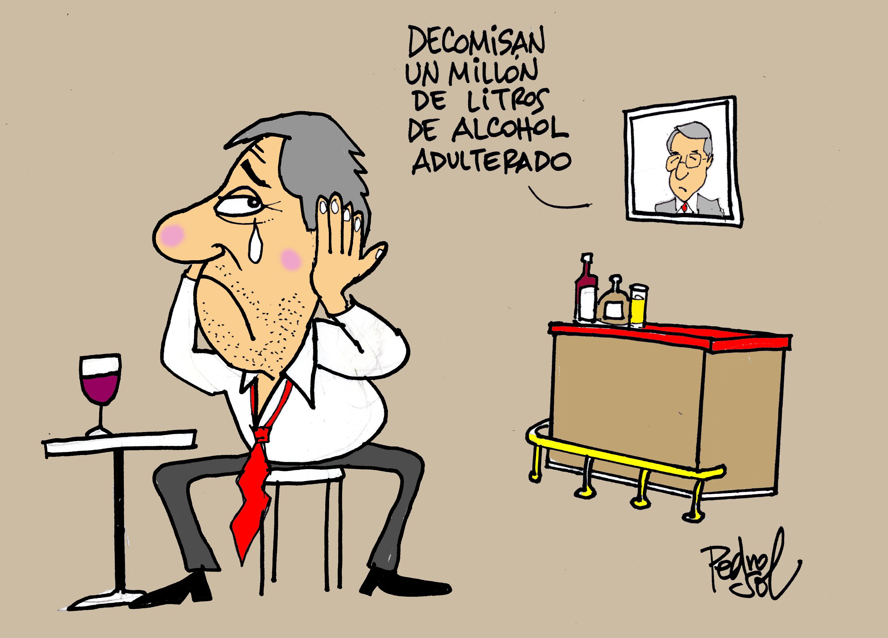El caricaturista Pedro Sol ilustra en su cartón ¡Quema mucho el sol! el decomiso histórico de alcohol adulterado por COFEPRIS