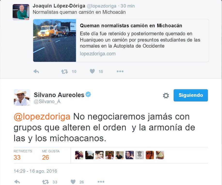 Por su parte, Silvano Aureoles, el gobernador del estado de Michoacán, señaló que ante los hechos realizados este día por los normalistas en la Autopista de Occidente, el gobierno no negociará con grupos que buscan alterar “el orden y la armonía” con los michoacanos.