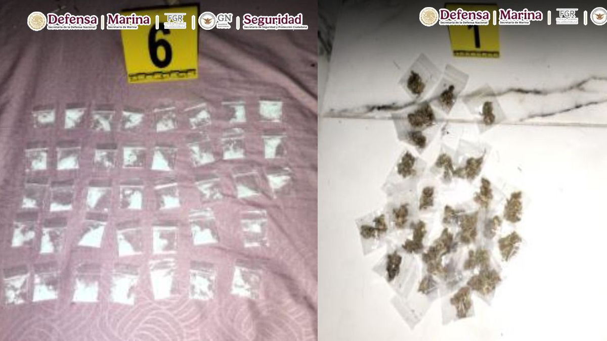 La segunda movilización ocurrió en el Fraccionamiento Paseos Kusamil, donde se incautaron 67 bolsas transparentes que en su interior contenían aparente mariguana y crystal.