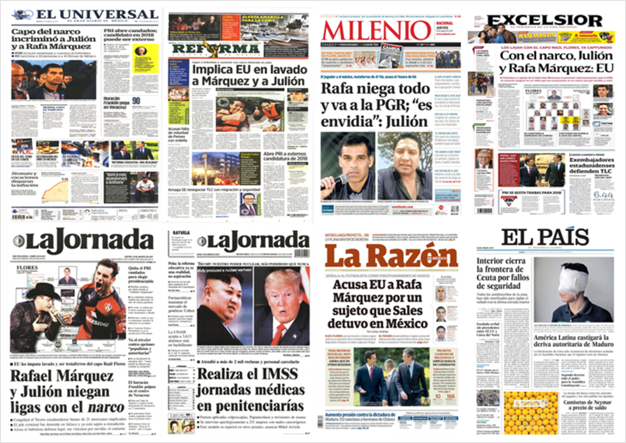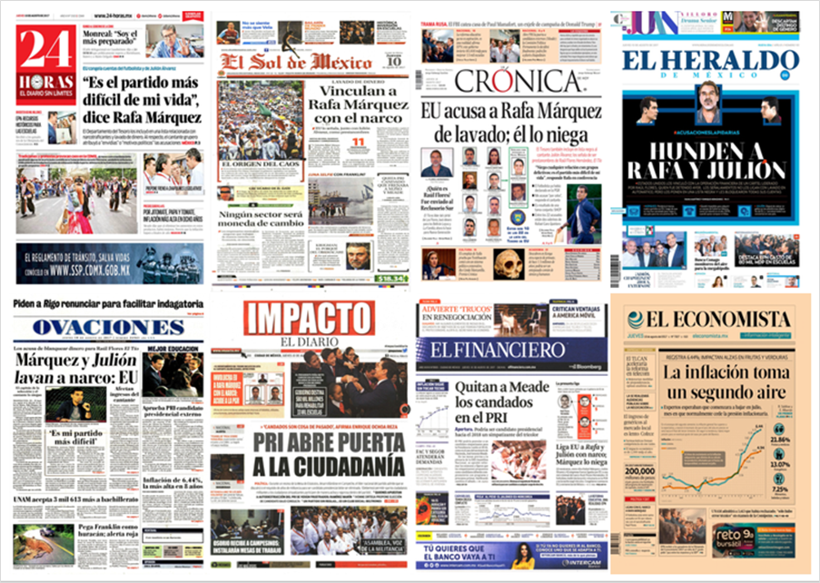 Este jueves, los principales periódicos de México destacaron en sus primeras planas que el futbolista Rafael Márquez y el cantante Julión Álvarez fueron incluidos por las autoridades en la lista de personas acusadas de actuar como prestanombres o testaferros del narcotráfico.
