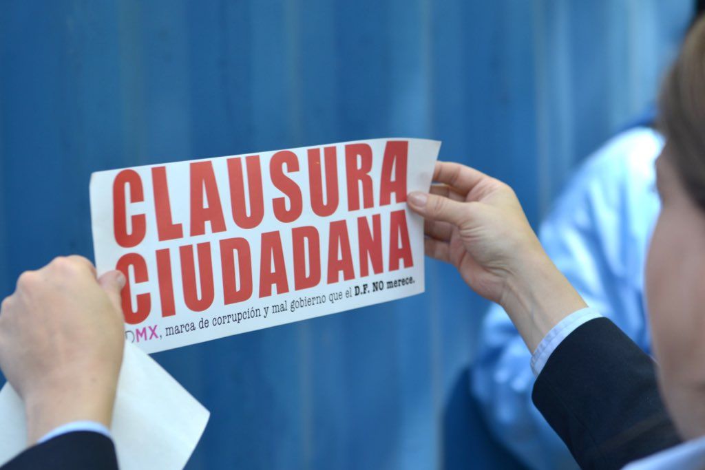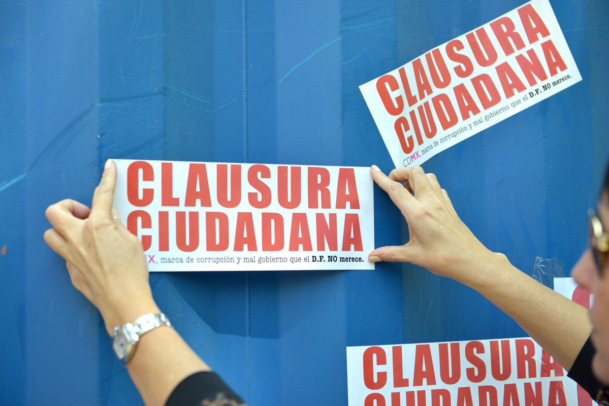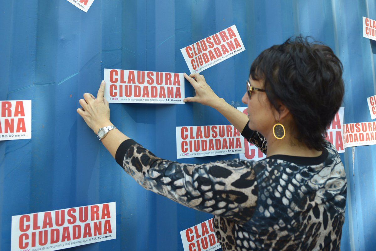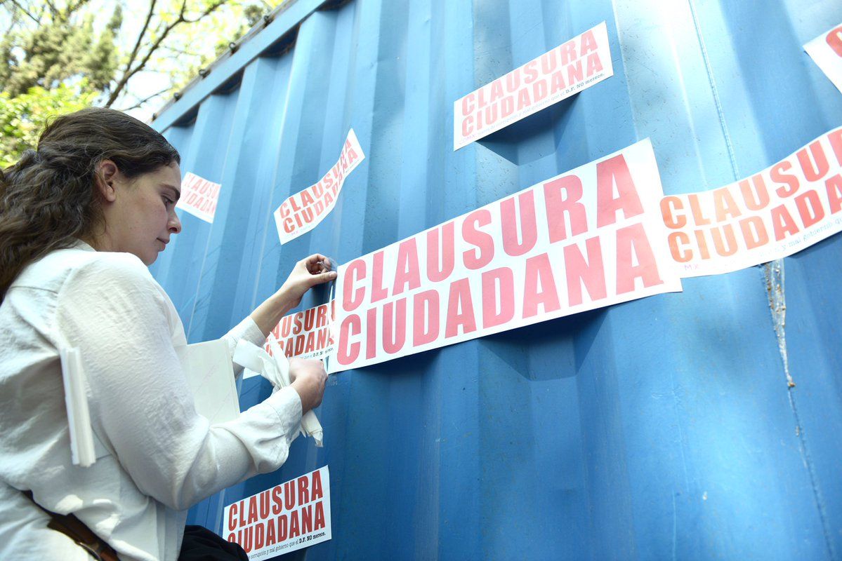En la protesta, el grupo de aproximadamente 30 manifestantes pegaron calcomanías con la frase “clausura ciudadana” en la zona donde se coloca la rueda.