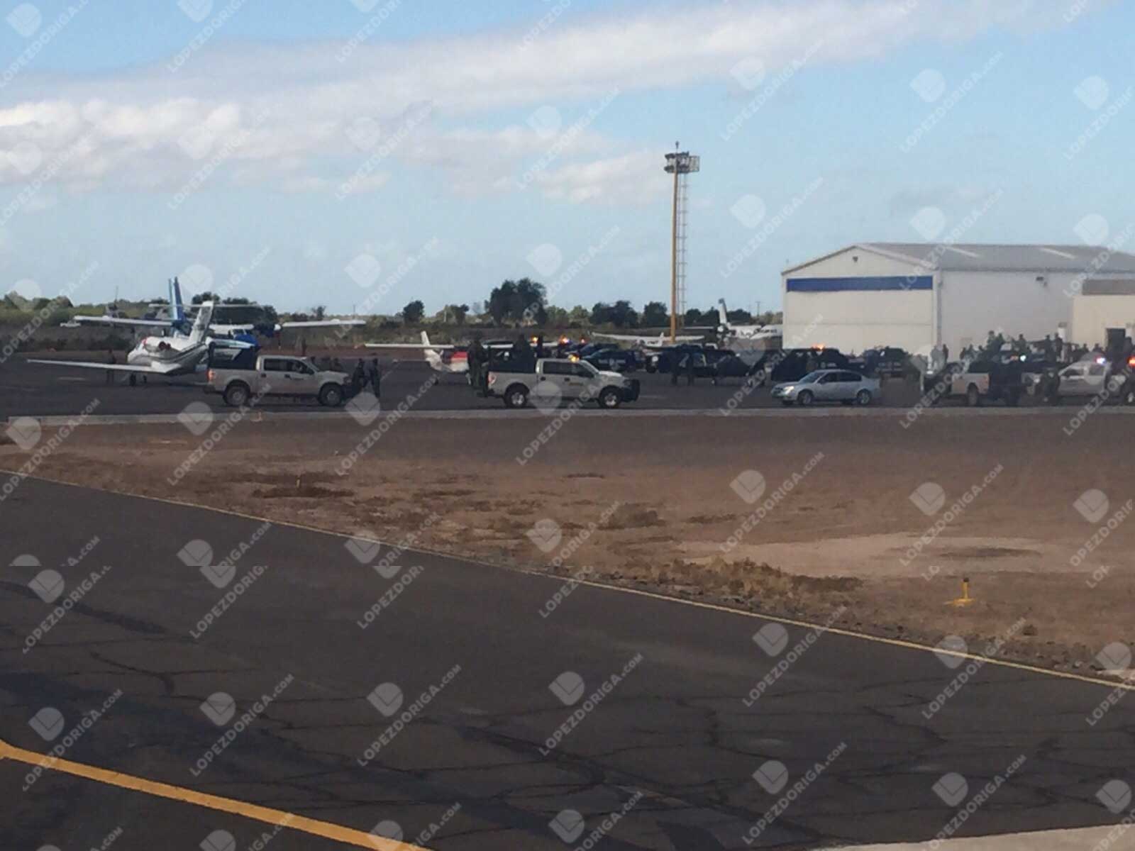 Una gran cantidad de elementos y vehículos fueron desplegados en el aeropuerto de Los Mochis, desde donde fue trasladado Guzmán Loera a bordo de un Learjet 35.