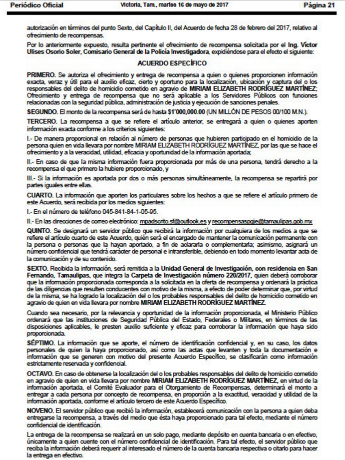 “Se autoriza el ofrecimiento y entrega de recompensa a quien o quienes proporcionen información exacta, veraz y útil para el auxilio eficaz, cierto y oportuno para la localización, ubicación y captura del o los responsables del delito de homicidio cometido en agravio de Miriam Elizabeth Rodríguez Martínez”.