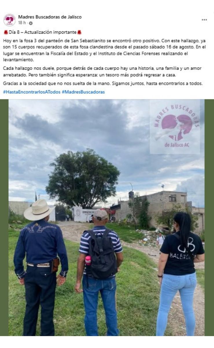 El colectivo Madres Buscadoras de Jalisco reportó la recuperación de 15 cuerpos de una fosa clandestina hallada en un panteón de Tlaquepaque.