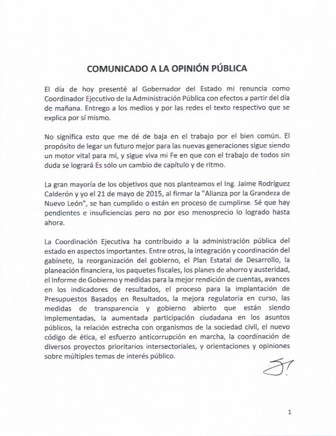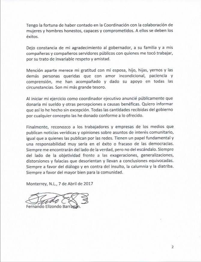 “Presento mi renuncia irrevocable. Me mueve hacerlo razones de carácter personal que son determinantes; mi familia y asuntos propios merecen mi atención y tiempo”, señaló Elizondo Barragán.