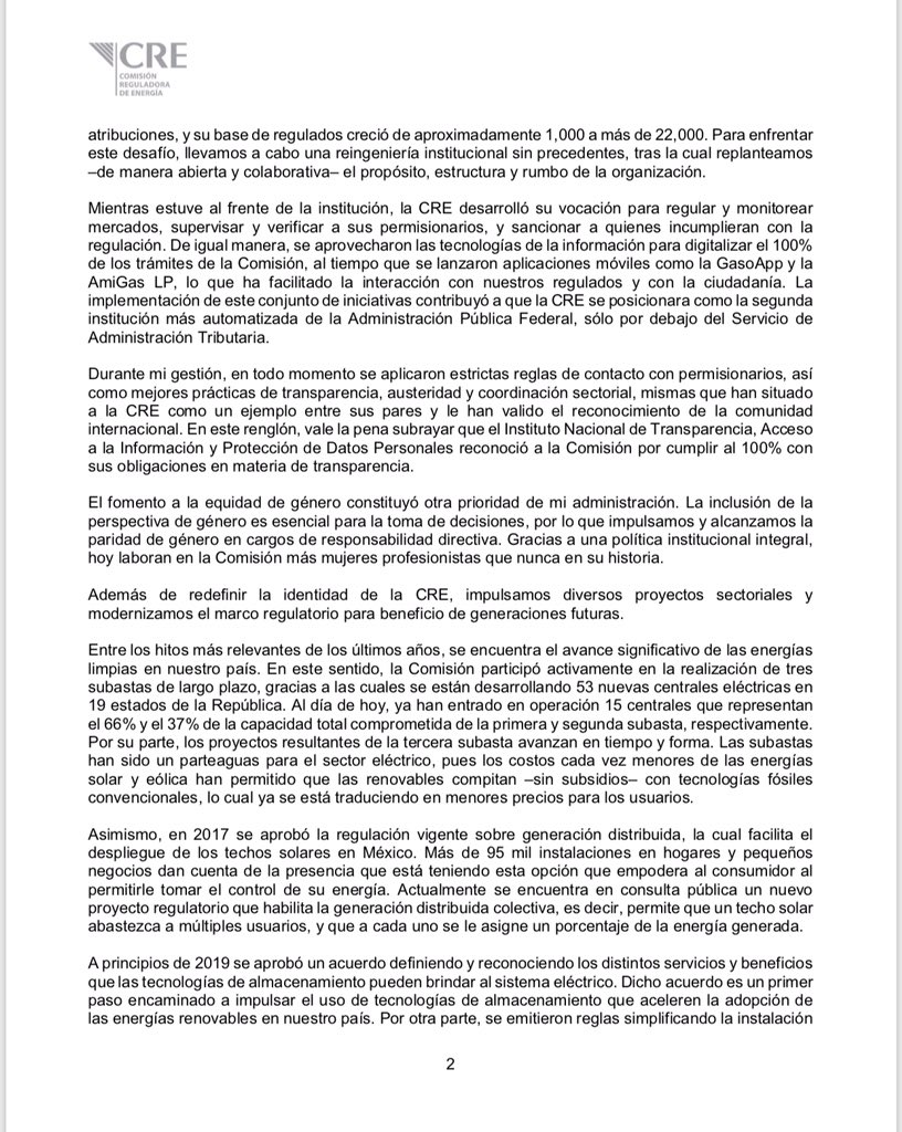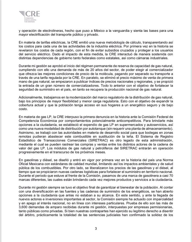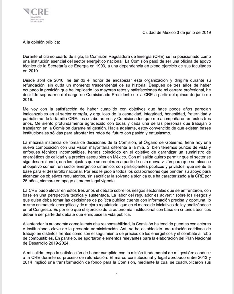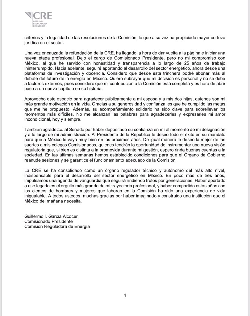 A través de redes sociales la comisión informó que García Alcocer “termina su ciclo en la CRE agradecido por la confianza que el Senado depositó en él, con la satisfacción de haber cumplido” en el cargo que ocupó durante tres años y adjuntó una carta a la opinión pública, firmada por el comisionado.