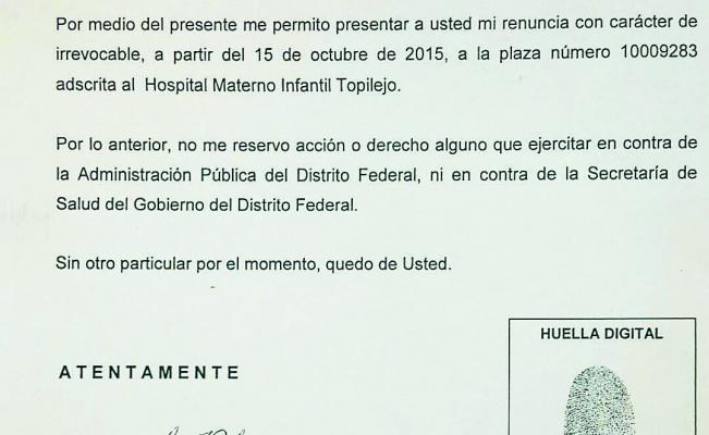 El documento, dirigido al titular de la Secretaría de Salud del Distrito Federal (SEDESA), Armando Ahued, indica: “Me permito presentar a usted mi renuncia con carácter de irrevocable, a partir del 15 de octubre de 2015, a la plaza número 10009283 adscrita al Hospital Materno Infantil Topilejo”.