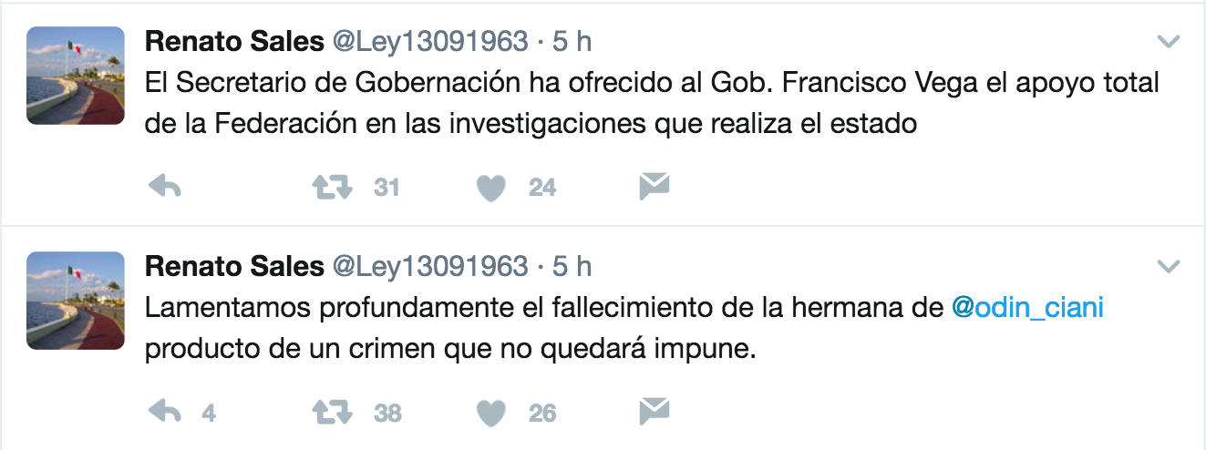 “El Secretario de Gobernación ha ofrecido al Gobernador Francisco Vega el apoyo total de la Federación en las investigaciones que realiza el estado”, señaló el funcionario en un segundo mensaje.