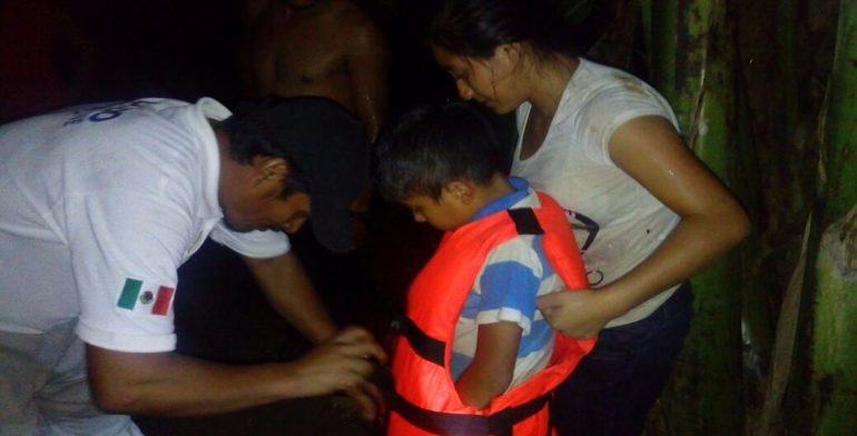 Efectivos de la Policía Municipal del municipio de Frontera Hidalgo, rescataron a 10 personas entre ellos siete niños que quedaron atrapados en una isla rodeados por las fuertes corrientes del río Suchiate cuando iban en busca de leña.