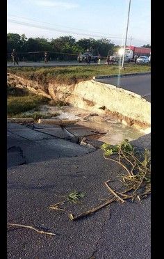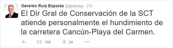 Expone en la red social que la Dirección General de Conservación de la SCT atiende el hundimiento de un tramo de la carretera Cancún-Playa del Carmen.