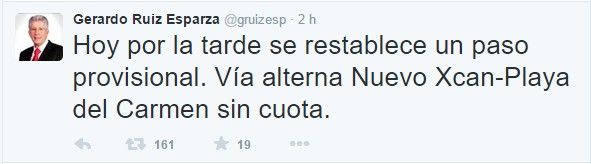 En su cuenta de Twitter, el funcionario federal refiere que una alternativa es la autopista Nuevo Xcan-Playa del Carmen, sin cuota.