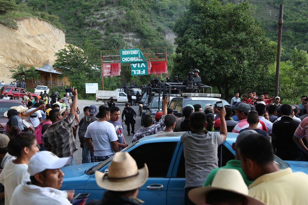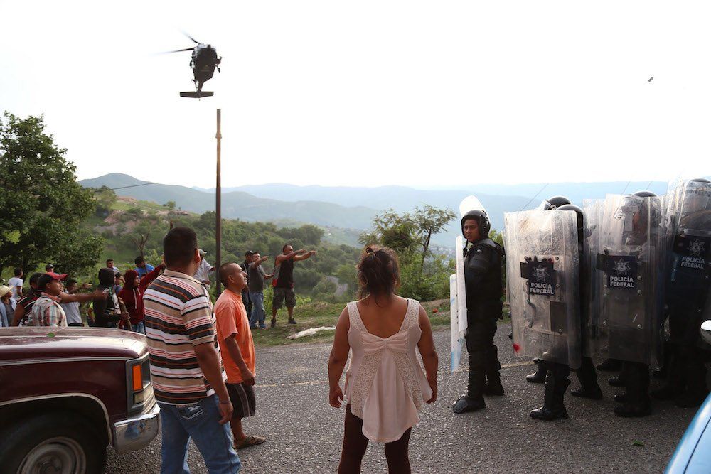 Un helicóptero sobrevoló la zona, mientras un centenar de policías en 24 patrullas quedaron retenidos en el cierre de la carretera federal que comunica a Chilpancingo. Los agentes intentaron dialogar con los pobladores con el fin de ser liberados y al ver que no ocurría, arribaron más efectivos con equipo antimotín, quienes abrieron el paso y liberaron a sus compañeros.