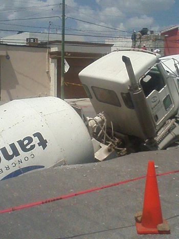La mañana de este lunes, un camión tipo revolvedora hoy por la mañana en un socavón de 12 metros de largo, cuatro de ancho y 3 de profundidad en la colonia Las Fuentes de Reynosa, informó Protección Civil Tamaulipas.