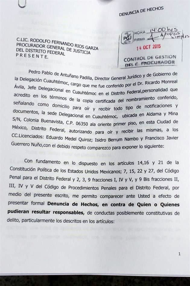 El equipo jurídico de la delegación Cuauhtémoc, presentó ante la PGJDF una denuncia por el paquete que recibió Ricardo Monreal con 1.5 mdp