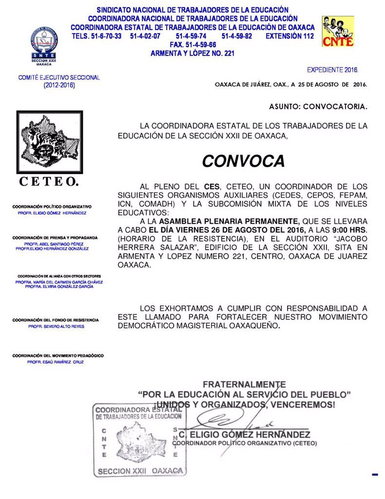 De acuerdo con la convocatoria, firmada por Eligio Gómez Hernández, Coordinador Político Organizativo se extendió la misiva esta mañana para reunir al Pleno del Comité Ejecutivo Seccional a convocar un coordinador de los siguientes organismos auxiliares: CEDES, CEPOS, FEPAM, ICN, COMADH y la Subcomisión mixta de los niveles educativos.