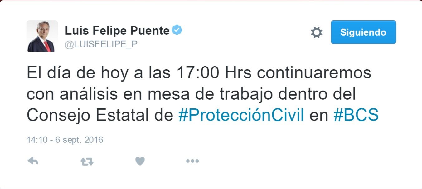 El funcionario, quien dijo encontrarse en la capital de Baja California Sur, dio el reporte de las condiciones actuales. “En este momento me encuentro en La Paz, llueve fuerte y hay viento fuere. Está pasando la parte trasera del fenómeno. A las 17:00 h tendremos una reunión para analizar las siguientes medidas”, señaló.