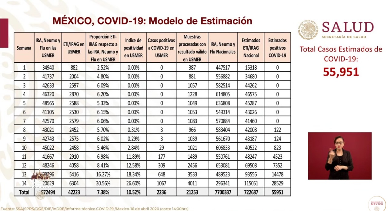 El subsecretario de Salud, Hugo López-Gatell, dio a conocer que, de acuerdo con el sistema de estimación o sistema centinela, el total de casos de COVID-19 en México sería de 55 mil 951 positivos.