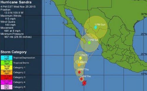 El Huracán Sandra subió su fuerza y se elevó la alerta a categoría tres, el fenómeno natural es el más intenso en un fin de temporada, se espera que para el jueves pueda tocar las costas de Sinaloa, y el viernes por la noche podría estar  tocando suelo en el sur de Baja California Sur.