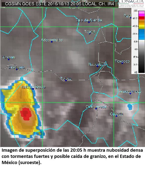 En tanto, en las próximas horas en el resto del país se pronostican tormentas muy fuertes (de 50 a 75 milímetros) en Veracruz y tormentas fuertes (de 25 a 50 mm) en Puebla, Tabasco, Jalisco, Colima, Michoacán, Guerrero, Oaxaca y Chiapas, así lo informó la