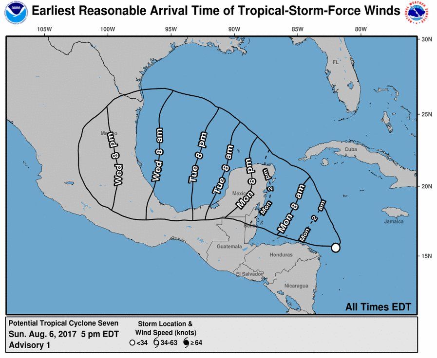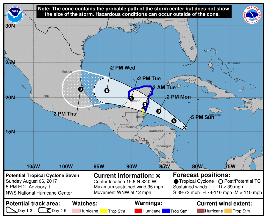 Este domingo, una zona de inestabilidad en el Mar Caribe aumentó de categoría para convertirse en la depresión tropical número 7, mientras se aproxima a la Península de Yucatán.