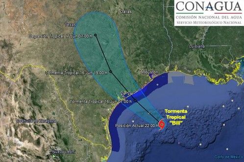 La mañana de este martes, Bill podría tocar tierra en la costa este de Texas y moverse en el sur-centro del estado durante la tarde y noche del día, donde perdería intensidad y pasaría a ser depresión tropical.