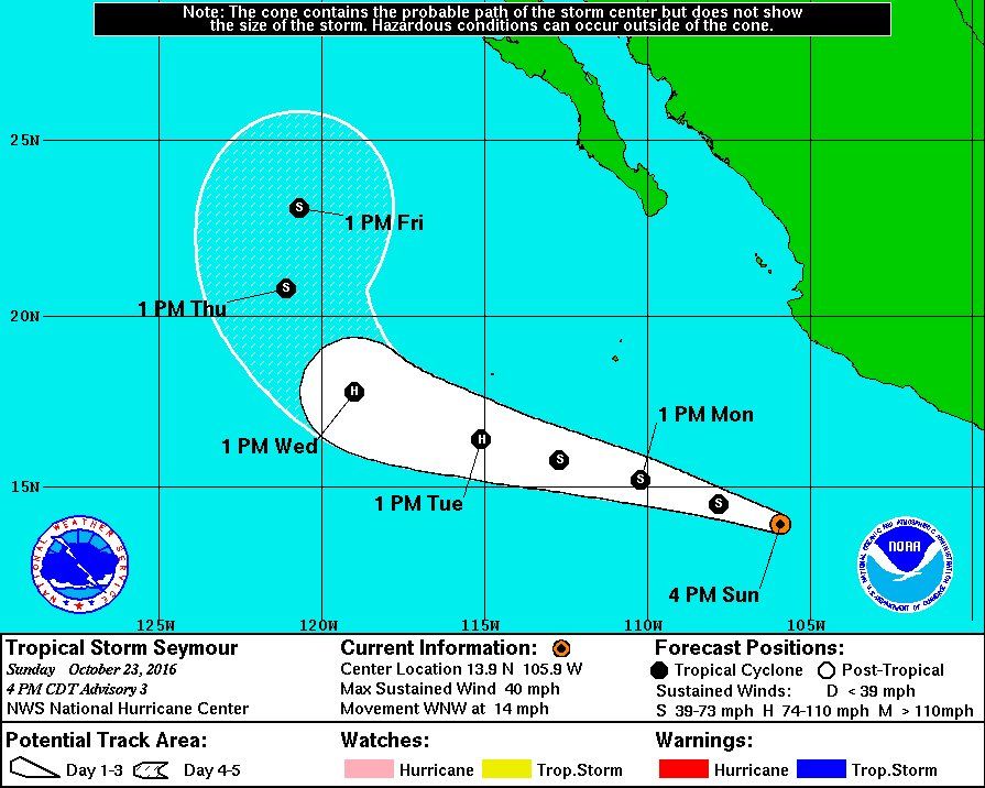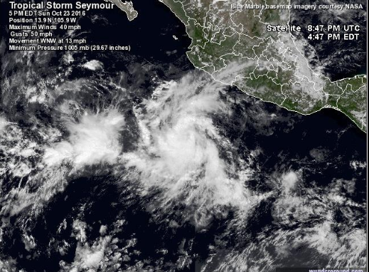 Seymour presenta rachas de viento de hasta 60 kilómetros por hora, y se encuentra actualmente a 590 kilómetros al suroeste de Manzanillo, Colima,
