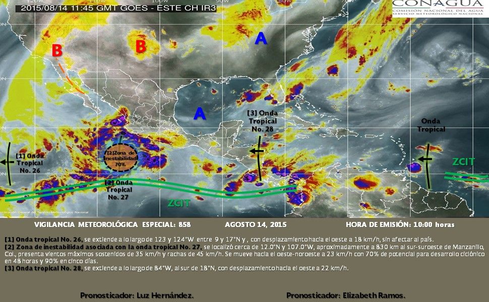 El organismo de la Comisión Nacional del Agua (Conagua) detalló que el fenómeno climático, asociado con la onda tropical 27, se localiza a 795 kilómetros al sur-suroeste de Punta San Telmo, Michoacán y a 830 al sur-suroeste de Manzanillo, Colima.