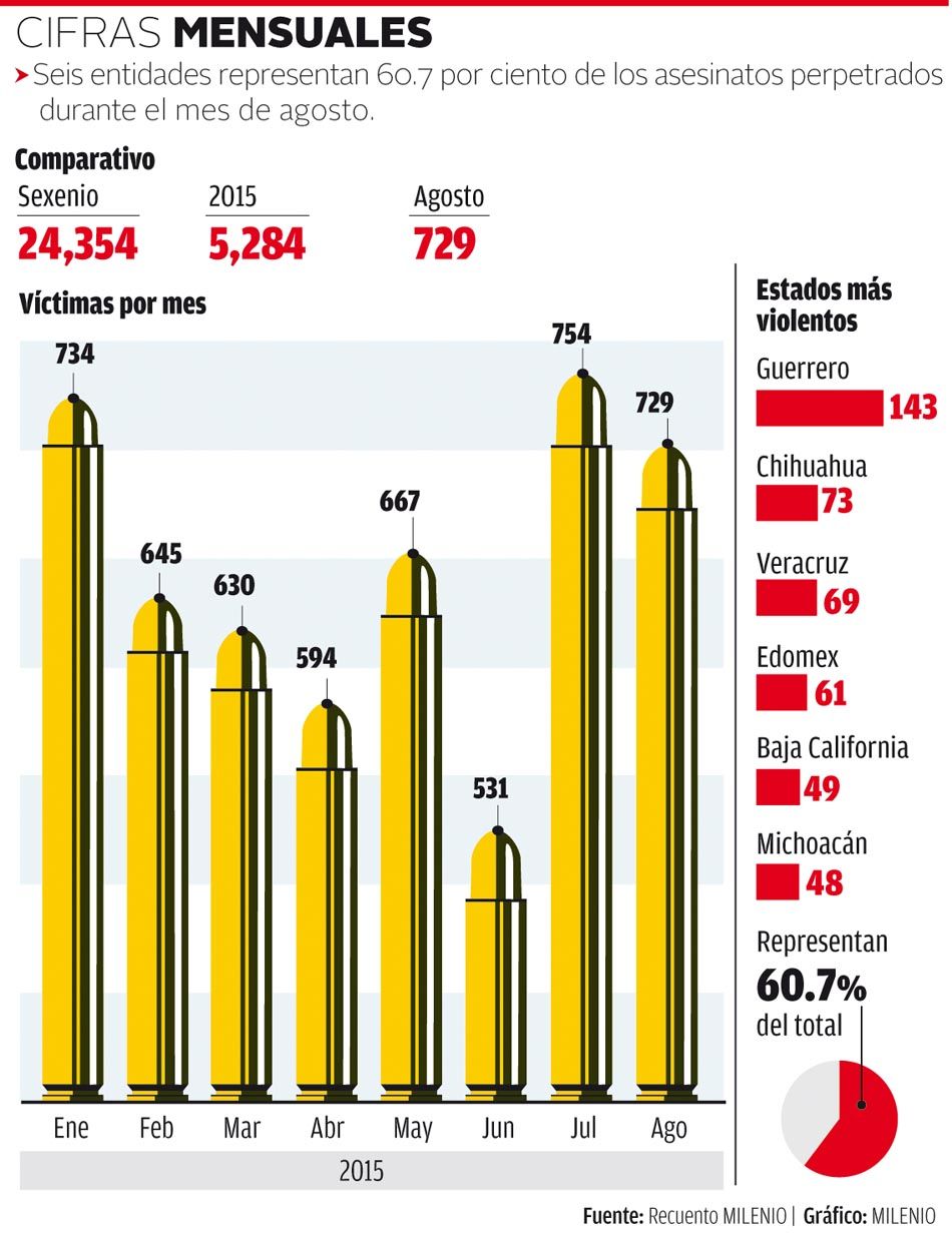 De acuerdo con un recuento del periódico Milenio, durante el mes de agosto se cometieron 729 homicidios relacionados con el crimen organizado, ubicándola en la tercera cifra más alta en lo que va de 2015.