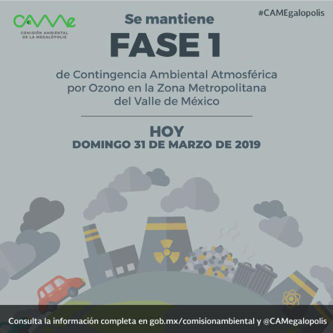 La Comisión Ambiental de la Megalópolis (CAMe) informó que se mantiene la Fase I de Contingencia Ambiental por Ozono, debido a que las condiciones meteorológicas continúan siendo desfavorables para la dispersión de los contaminantes.