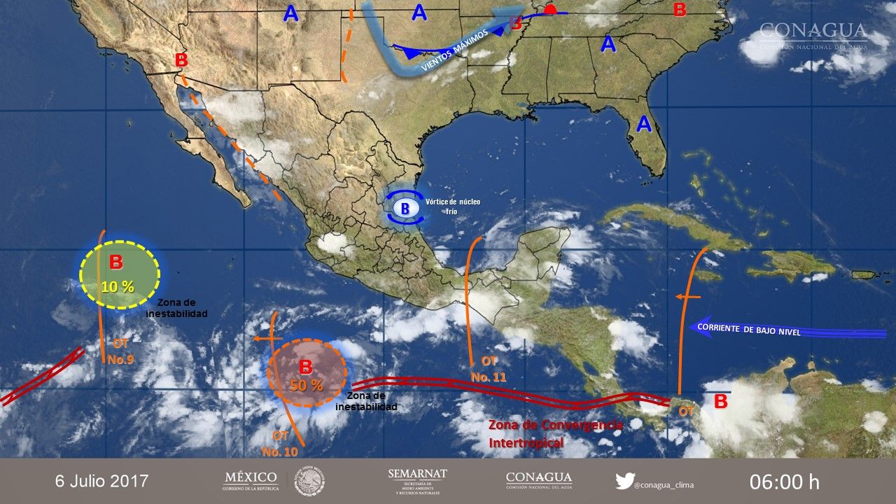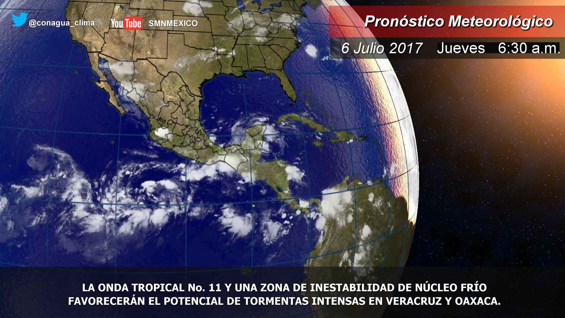 Se prevén tormentas intensas en regiones de Veracruz y Oaxaca, y tormentas muy fuertes con relámpagos en sitios de Michoacán, Guerrero, Chiapas, Puebla y Tabasco. Asimismo, generará tormentas fuertes en zonas de Nayarit, Jalisco, Colima, Estado de México, Ciudad de México, Morelos, Campeche y Yucatán.