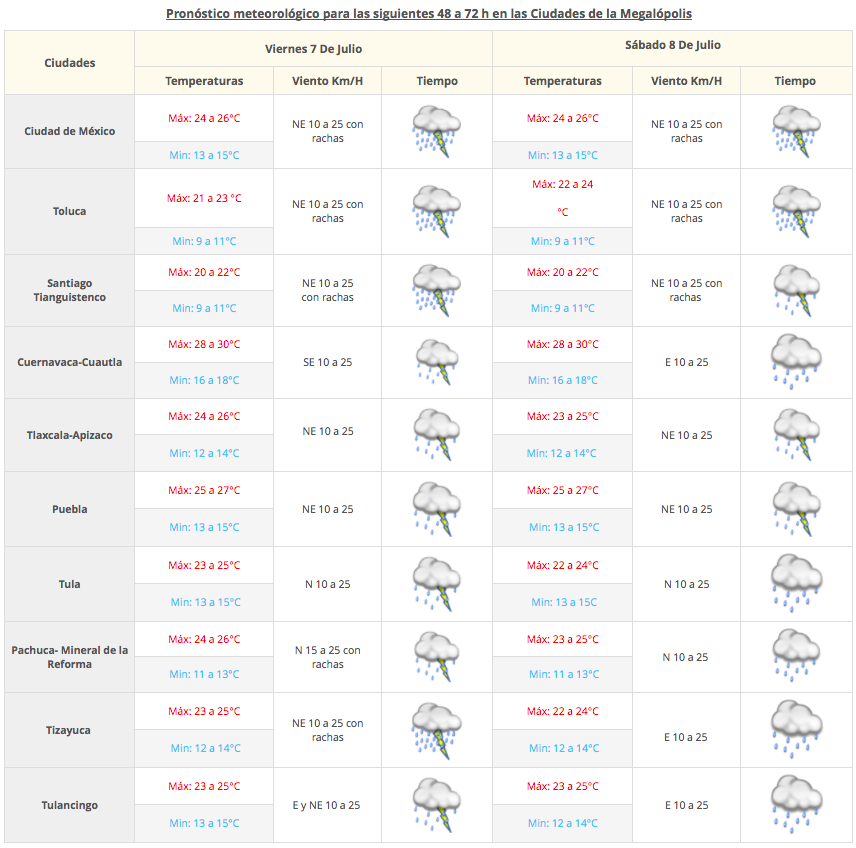 El Servicio Meteorológico Nacional (SMN) pronosticó para la tarde de este en el Valle de México cielo nublado con lluvias y tormentas puntualmente fuertes, acompañadas de descargas eléctricas y posible caída de granizo.