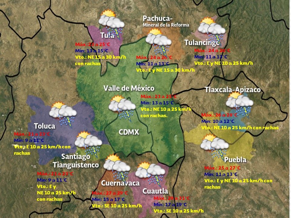 En la Ciudad de México se prevé temperatura máxima de 23 a 25 grados Celsius y mínima de 13 a 15 grados, mientas que para el Estado de México se estiman temperaturas máximas de 22 a 24 grados y mínimas de 9 a 11 grados.