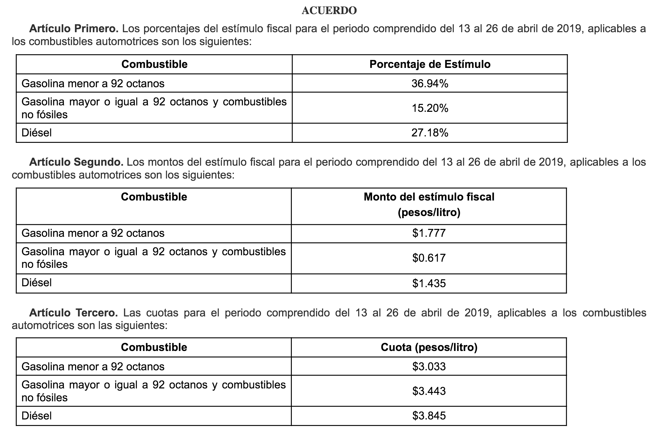 Del 13 y hasta el 26 de abril, el estímulo fiscal a la gasolina Magna será de 1.77 pesos por litro, mayor al anterior, de 1.62 pesos. El estímulo aplicable al diésel subirá de 1.31 a 1.43 pesos por litro, de acuerdo con una publicación del Diario Oficial de la Federación (DOF).
