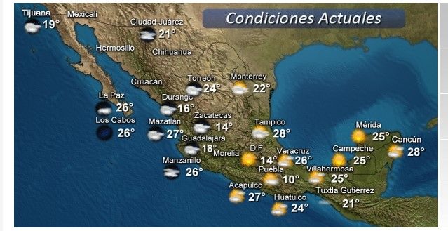 El Meteorológico indicó que los valores serán mayores de 40 grados centígrados en Baja California, Sonora, San Luis Potosí, Hidalgo, Puebla, Veracruz, Tabasco, Campeche y Yucatán; y se prevén de 35 a 40 grados en Baja California Sur, Chihuahua, Coahuila, Nuevo León, Tamaulipas, Durango, Sinaloa, Nayarit, Jalisco, Colima, Michoacán, Guerrero, Oaxaca, Chiapas y Quintana Roo.