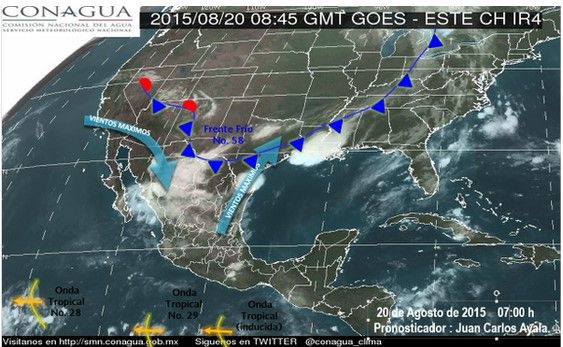 Dicha combinación de sistemas generará potencial de lluvias fuertes en Sonora, Durango, Sinaloa, Nayarit, Jalisco, Zacatecas, Michoacán, Guanajuato, Querétaro, Hidalgo, Veracruz, Puebla, Tlaxcala, Estado de México, Morelos, Guerrero, Oaxaca, Chiapas, Tabasco, Campeche, Yucatán y Distrito Federal.