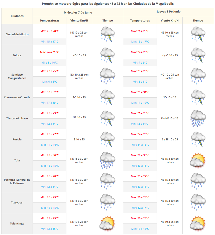 En la Ciudad de México se pronostica una temperatura máxima de 27 a 29 grados centígrados y una mínima de 14 a 16 grados con viento de componente norte de 10 a 25 km/h con rachas de 40 km/h en zona de tormenta.
